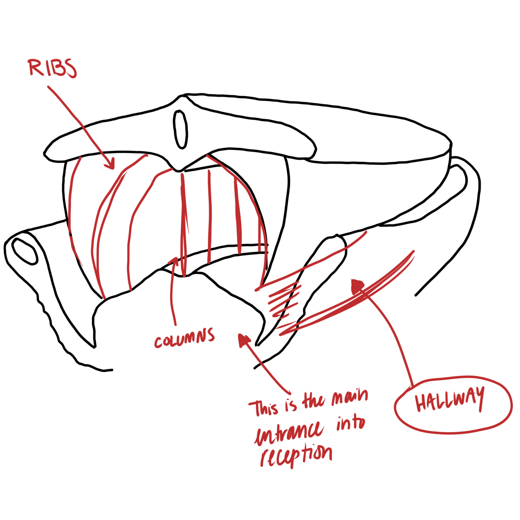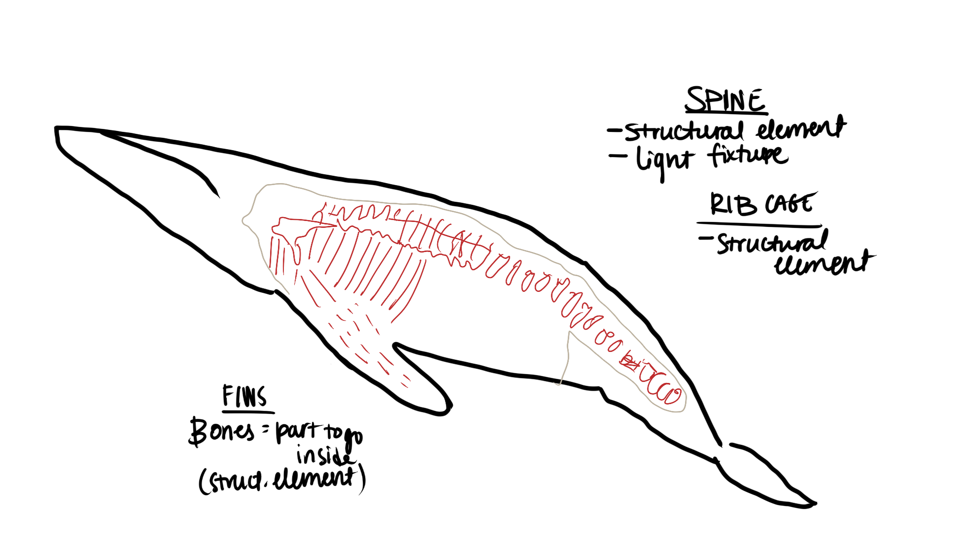 The architectural framework directly references a whale's skeletal anatomy; curved, rib-like structural members create an expansive interior that feels both protective and immersive. This organic geometry mimics the interiority of a whale’s body, grounding the visitor in the sheer scale of marine life.
